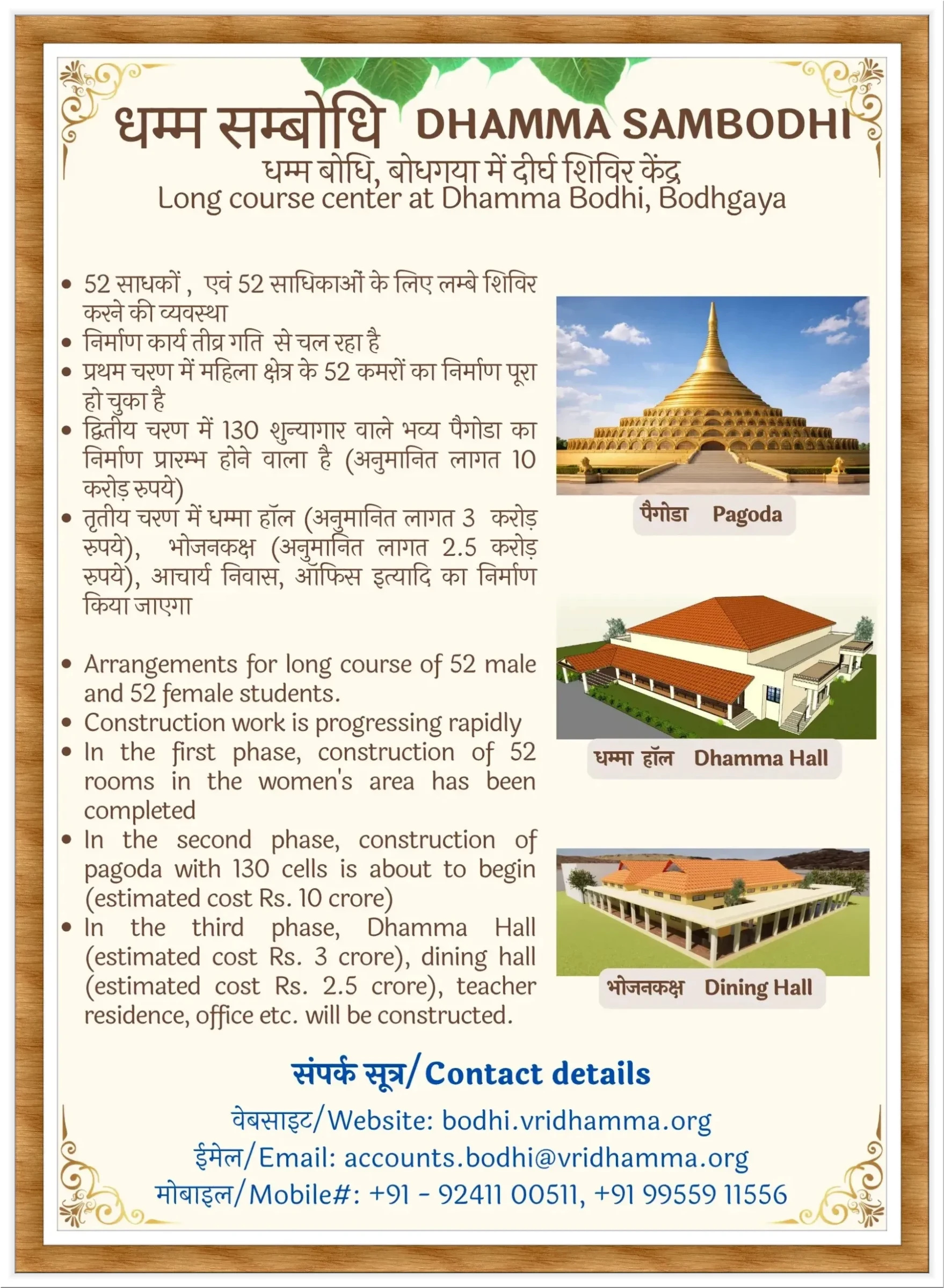 Tathagat attained enlightenment 2600 years ago under the Bodhi Tree at Bodhgaya. Dhamma Bodhi meditation centre is 4 kms away from this place. This entire area is engulfed with pure dhamma vibrations, which is very supportive in strengthening Vipassana practice. Hence, old students have been again and again requesting that a Long course centre be established in Bodhgaya. Keeping this in mind, it has been planned to have a long course center in Bodhgaya. On a land of 8 acres, this long course center will be constructed, for which master plan is complete. This center will have capacity for 100 students. This long course center has been given the name “ DHAMMA SAMBODHI”. Dhamma Sambodhi will have 104 student residences, a pagoda with 120 cells, male and female AT rooms, dining halls, course offices, store etc. Around Rs 20 Cr is the estimate of this entire project.